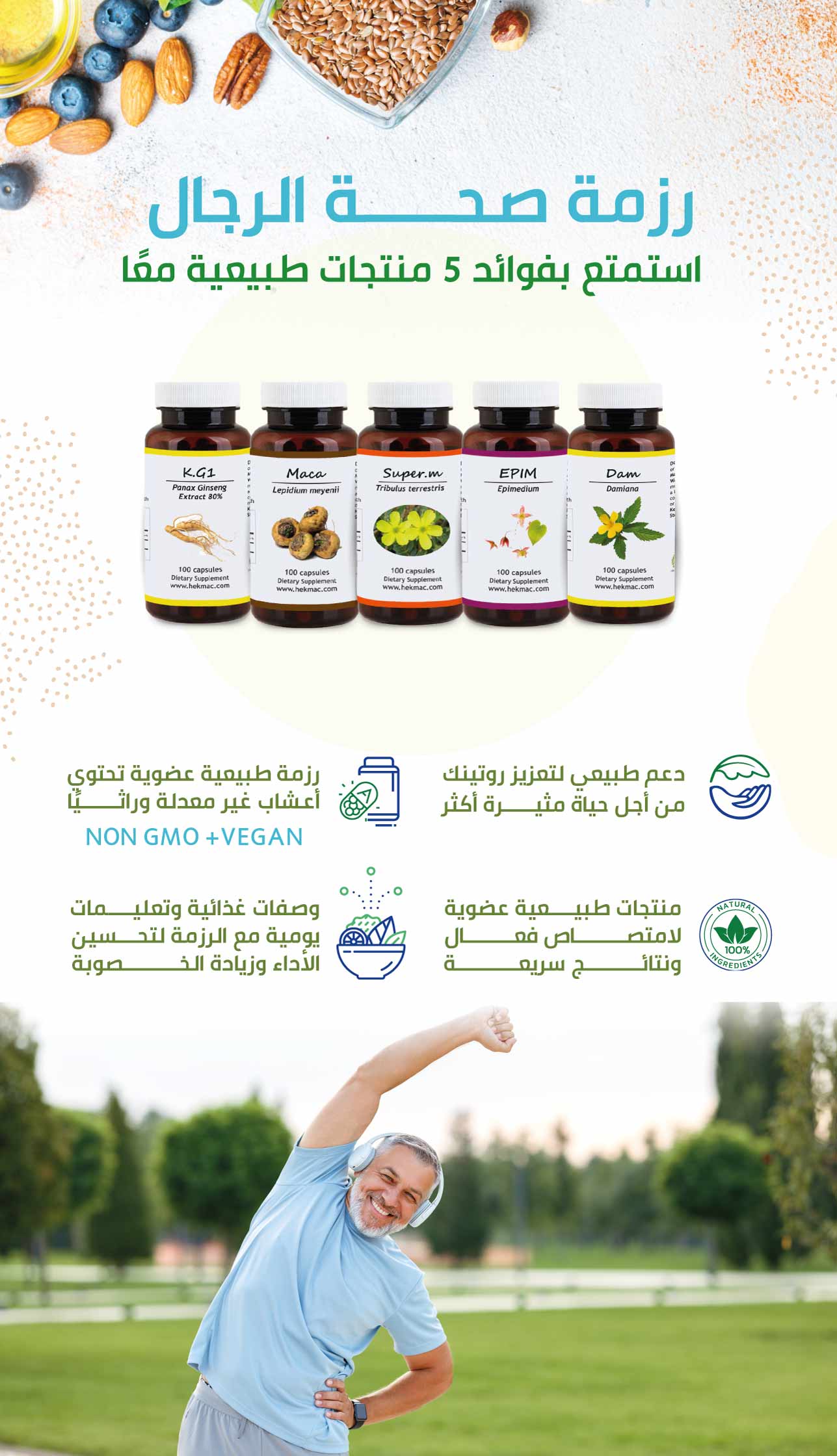 تتكون رزمة صحة الرجال من 5 منتجات طبيعية عضوية ذات خصائص متنوعة تساعد على دعم عافيتك وصحتك العامة والتي قد تساعد في تعزيز الحيوية، وتحسين القدرة على التحمل، توازن الهرمونات وتساعد على تحسين الخصوبة، تساهم في تحسين الأداء الجنسي وزيادة الإثارة والشهوة وإطالة العلاقة مع تحسين واطالة الأنتصاب وتأخير القذف والسيطرة على الضعف الجنسي لدى الرجال.
