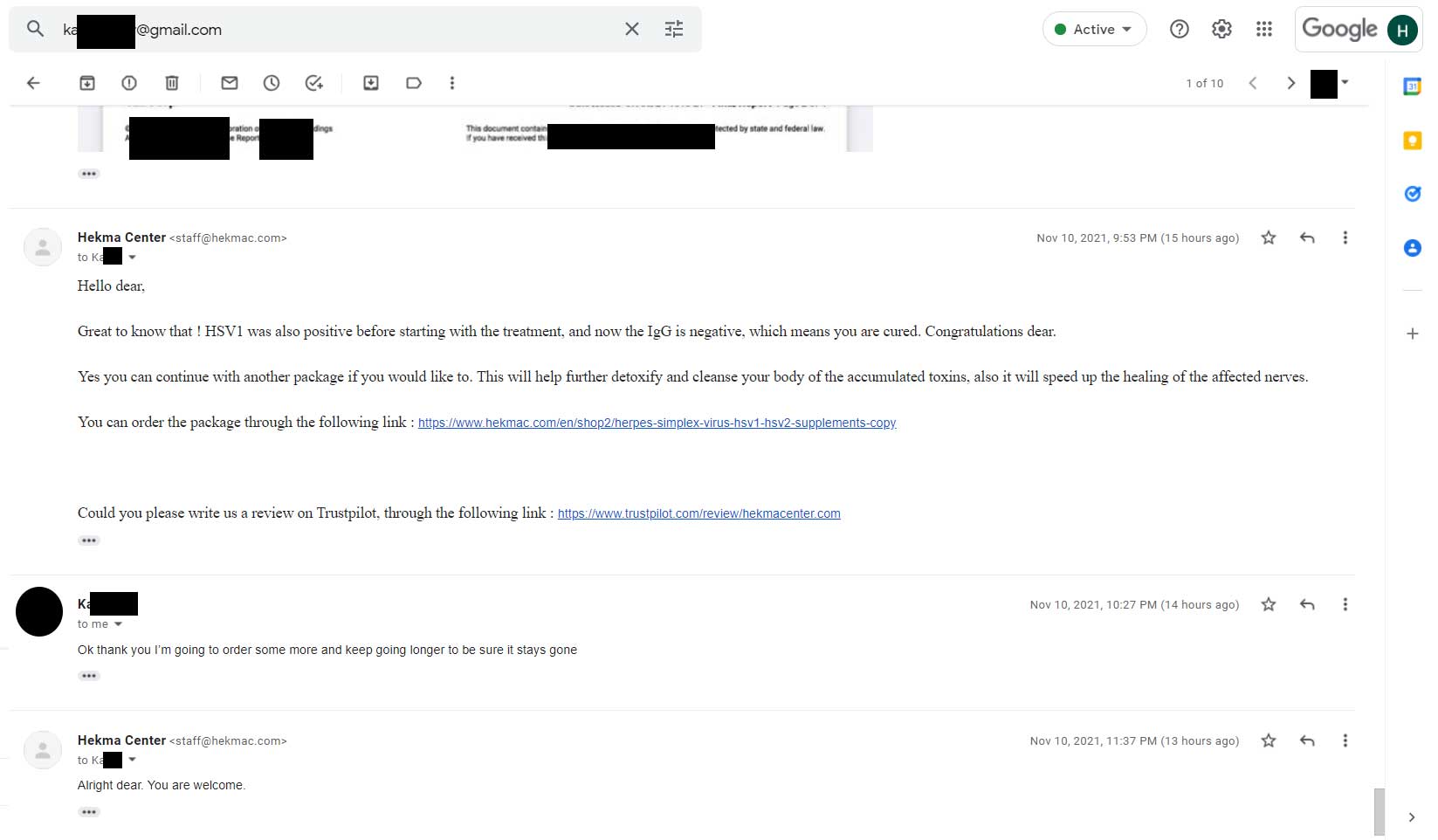 Ms. Ka contacted Hekma Center’s team on July 06, 2021, through email. Informing them that she purchased The Package for HSV, and needs to know exactly what to eat.